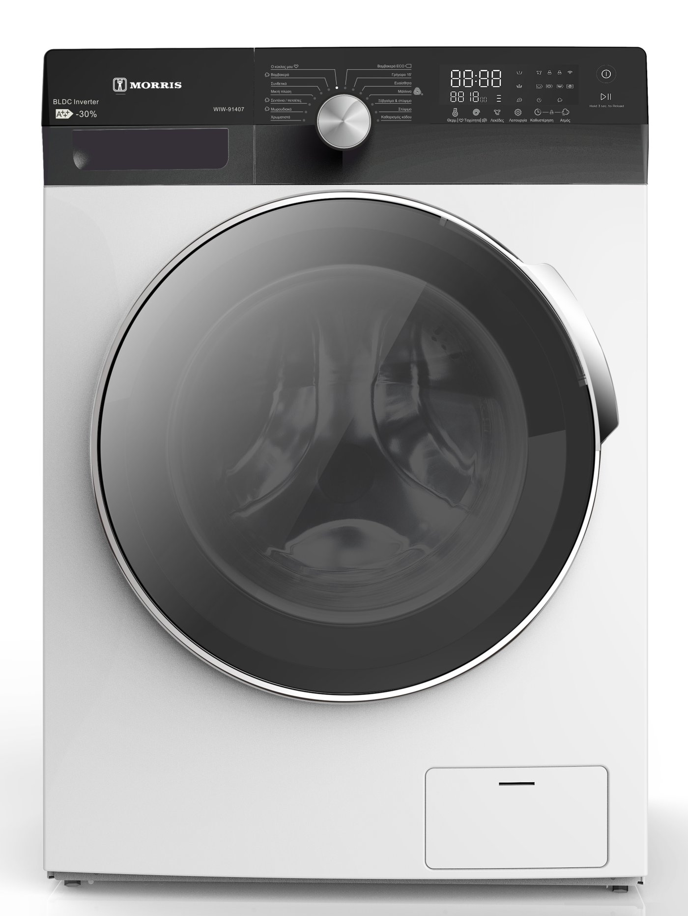 - Ηλεκτρονικός έλεγχος λειτουργίας με χειριστήριο αφής, μεγάλη LCD οθόνη, και ένδειξη υπολειπόμενου χρόνου πλύσης