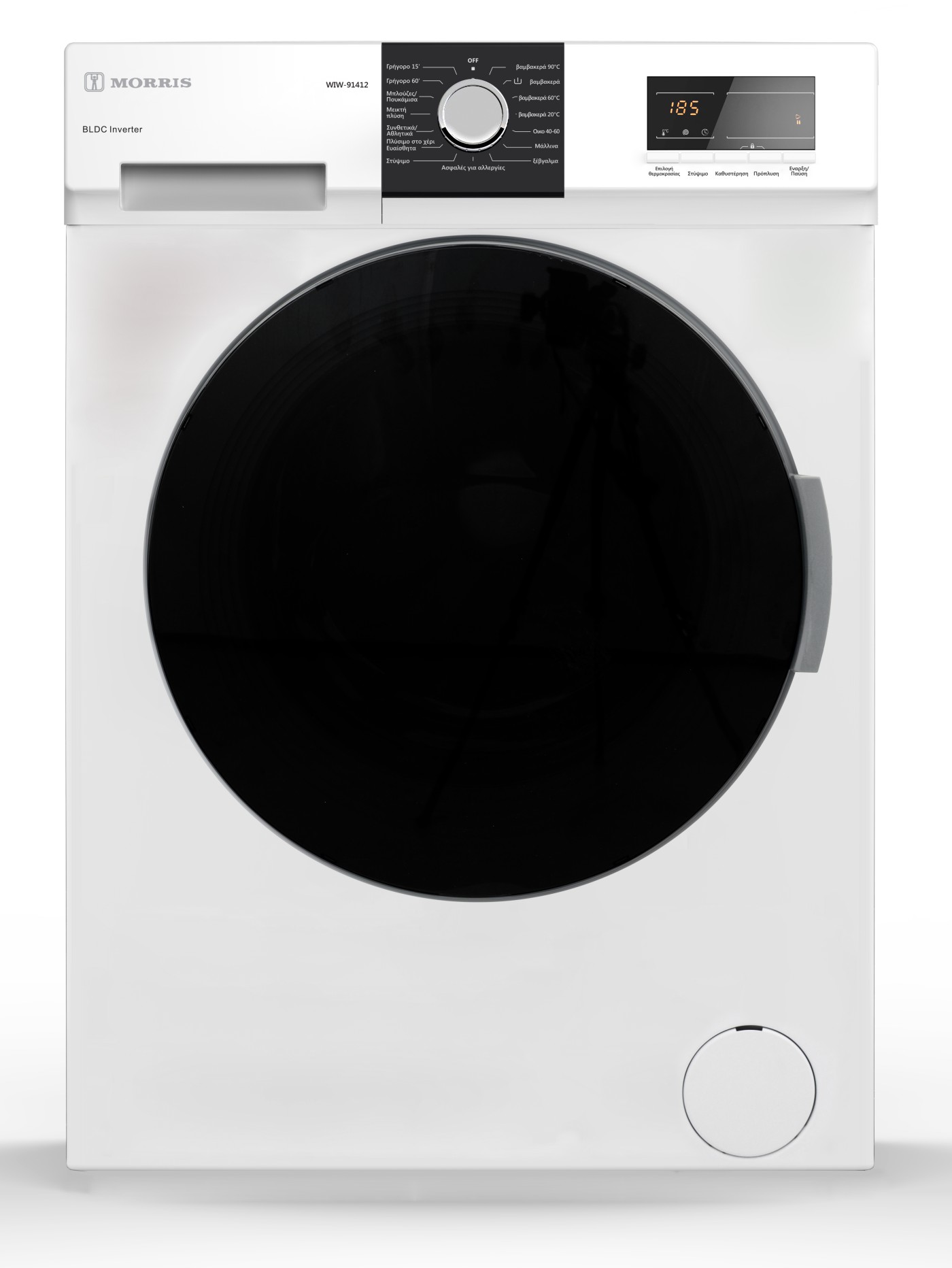 - Ηλεκτρονικός έλεγχος λειτουργίας με οθόνη LED και ένδειξη υπολειπόμενου χρόνου πλύσης