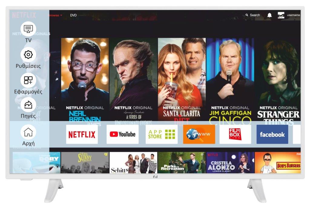 • Smart TV με προεγκατεστημένες εφαρμογές και πλήρη πρόσβαση στο διαδίκτυο μεσο πλοηγού